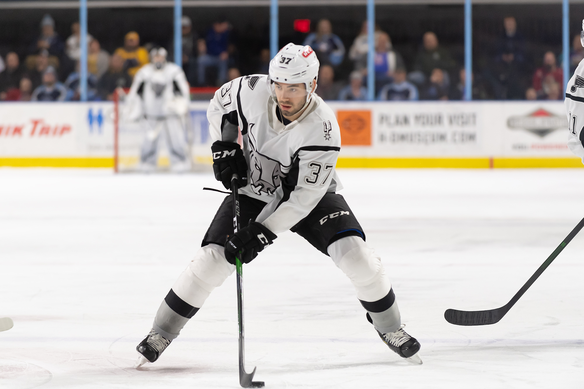 With the Griffins leading 3-2 midway through the third period, Poganski brought the puck into the Griffins zone. Poganski was clipped by a high stick from Dylan McIlrath, but still pushed a pass forward to send Vecchione in alone on goaltender Pat Nagle. Nagle made the save, but Jordan Nolan slid the rebound back in front for a Poganski finish. Poganski’s ninth of the season at 12:40 tied the game 3-3.