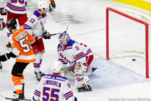 A shot by Claude Giroux #28 of the Philadelphia Flyers (not pictured) scores against Igor Shesterkin #31 of the New York Rangers in the second period.