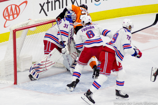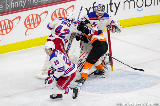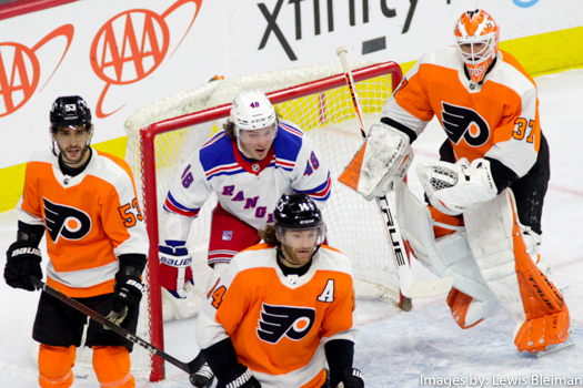 Shayne Gostisbehere #53, Sean Couturier #14, Goalie Brian Elliott #37 of the Philadelphia Flyers and Brendan Lemieux #48 of the New York Rangers