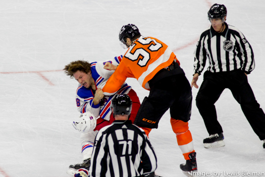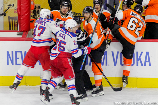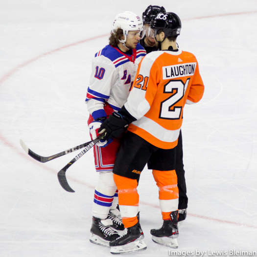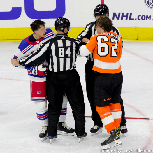 Lineman #84 Tony Sericolo separates Ryan Strome #16 of the New York Rangers and Nicolas Aube-Kubel #62 of the Philadelphia Flyers