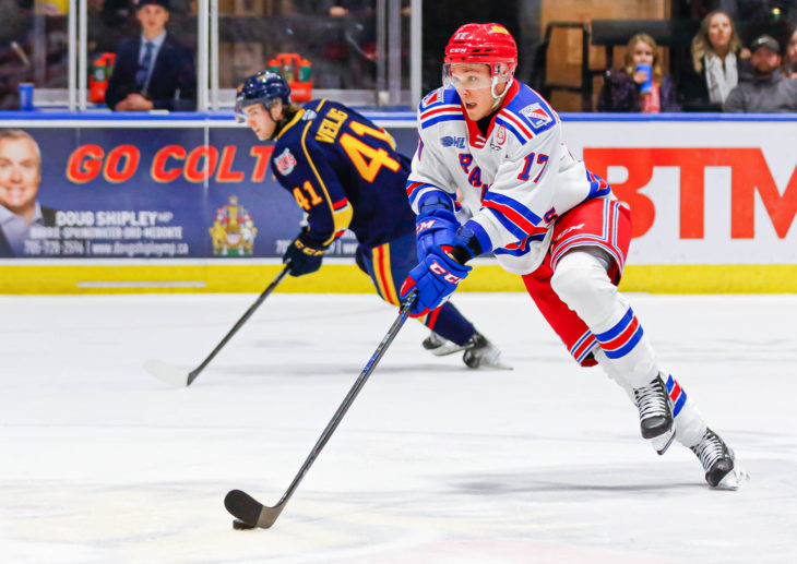Barrie, Ont. – The Rangers knocked off the Eastern Conference’s third place Barrie Colts Saturday night after earning a 4-3 overtime road victory to finish the weekend perfect with two wins. Danny Zhilkin (Winnipeg Jets) secured the victory scoring the overtime winner at 3:25 of the extra frame. Francesco Arcuri (Dallas Stars) scored goals number 34 and 35 and Marcus Vandenberg was fantastic between-the-pipes stopping