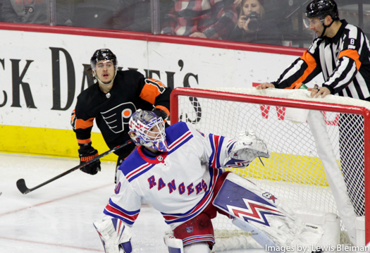 Claude Giroux #28 of the Philadelphia Flyers carries the puck in against Alexandar Georgiev #40 of the New York Rangers