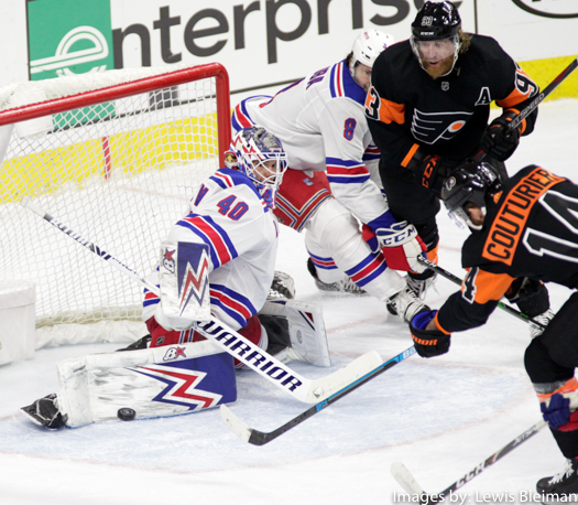 A scoring chance by Sean Couturier #14 of the Philadelphia Flyers is blocked by Goalie Alexandar Georgiev #40 of the New York Rangers