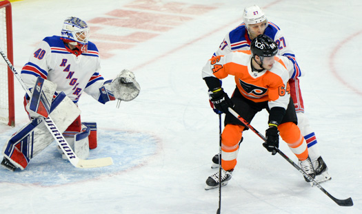 Philadephia Flyers David Kase #72 set the screen against New York Rangers Goalie Alexandar Georgiev #40