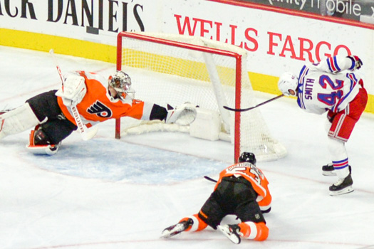 DSC_4139 Published February 19, 2021 at 525 × 350 in Rangers snap skid with win over Flyers Philadelphia Flyers Goalie Carter Hart #79 Attempts to block a shot by New York Rangers Brendan Smith #42 in the third period