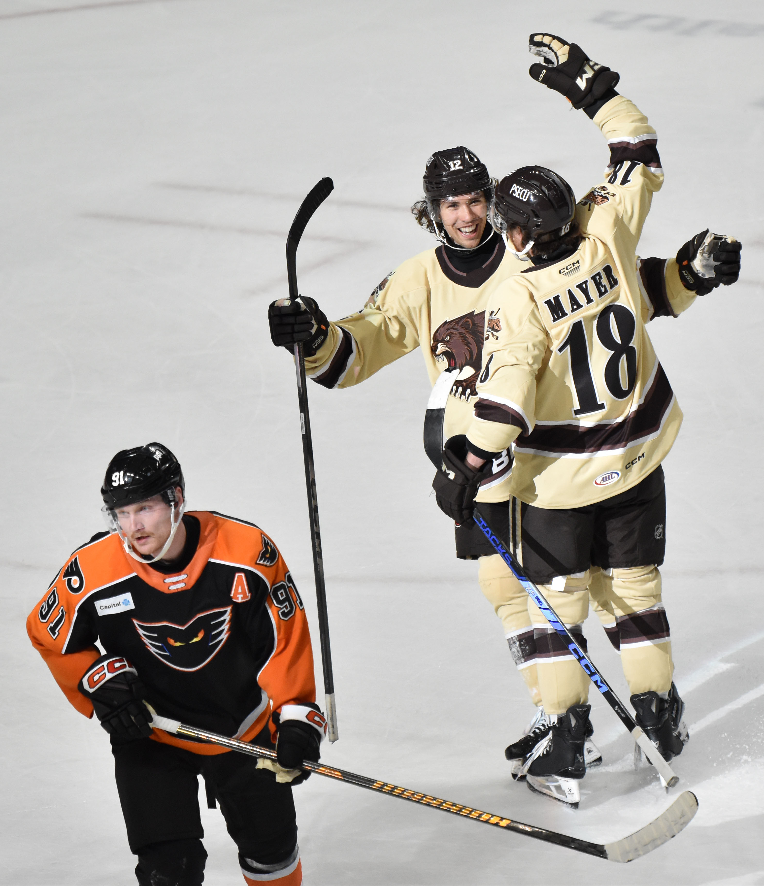Defenseman Connor Mayer (recalled from ECHL South Carolina earlier today) and D.J. King (signed by Hershey from South Carolina to a professional tryout agreement earlier today) made their Hershey debuts and both factored in the offense for the afternoon.