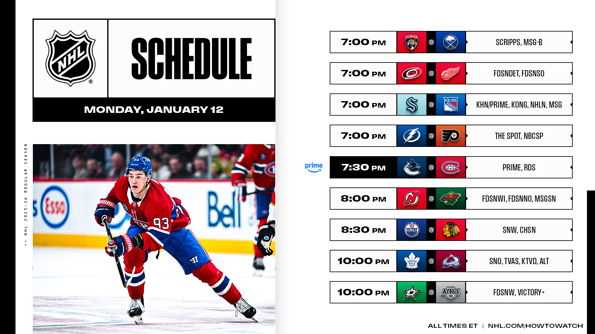 * Monday’s schedule is set to feature another “Hughes Bowl,” several streaks on the line, the No. 91 being retired as well as a Prime Monday Night Hockey game between the Canucks and Canadiens, one of several all-Canadian national telecasts slated for the week ahead including three during the 26th annual Scotiabank Hockey Day in Canada.