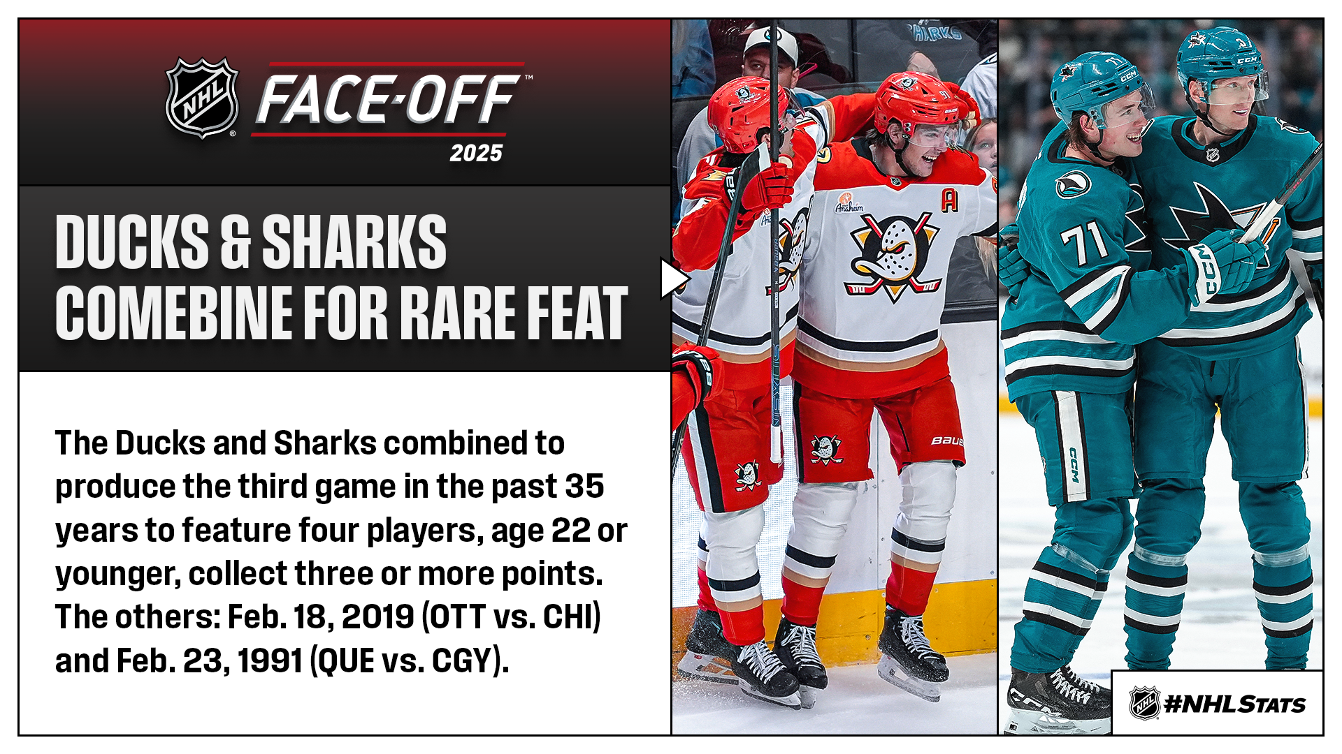 Macklin Celebrini (0-3—3) and Will Smith (0-3—3) propelled the Sharks to 2-0, 3-2 and 6-4 leads, but Ducks teammates Leo Carlsson (1-2—3) and Mason McTavish (0-3—3) spearheaded a dramatic come-from-behind overtime victory at SAP Center as Anaheim erased a multi-goal deficit in the final 10 minutes of regulation thanks to a tying tally in the final 60 seconds.