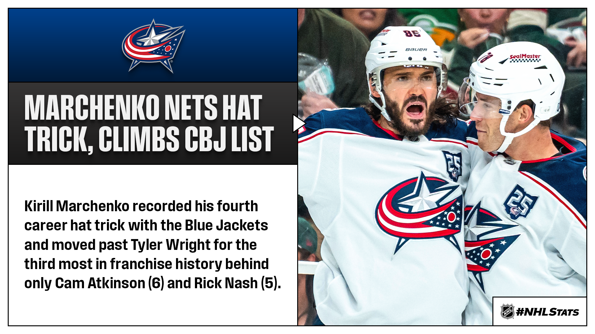 * Kirill Marchenko (3-0—3) scored a hat trick while his teammates Zach Werenski (1-2—3) and Boone Jenner (1-2—3) each posted three-point games as the Blue Jackets netted seven goals against the Wild en route to their first victory of the 2025-26 season. Werenski, who scored his 114th career goal and moved into sixth place on the Blue Jackets all-time list, registered his 16th career three-point game and tied David Vyborny for the fourth most in franchise history. Jenner, with the help of his 200th career goal, also moved into a tie for seventh place on that same list.