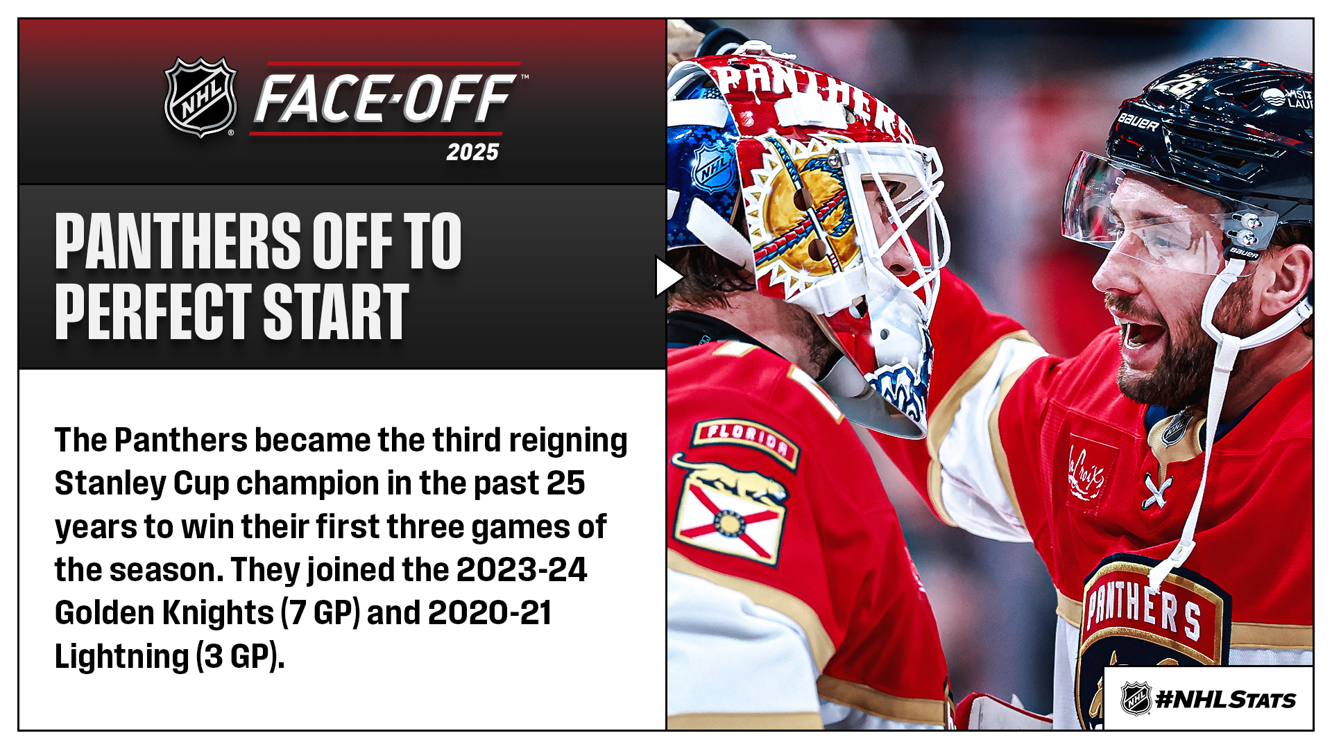 * The reigning Stanley Cup champion Panthers received goals from six different scorers, including Sam Reinhart (1-0—1), who was one of six players already named to Team Canada’s preliminary roster for the Olympic Winter Games Milano Cortina 2026. Florida, which started a season with three straight wins for the third time in franchise history, is one of two teams off to a perfect 3-0-0 start this season, alongside Boston.