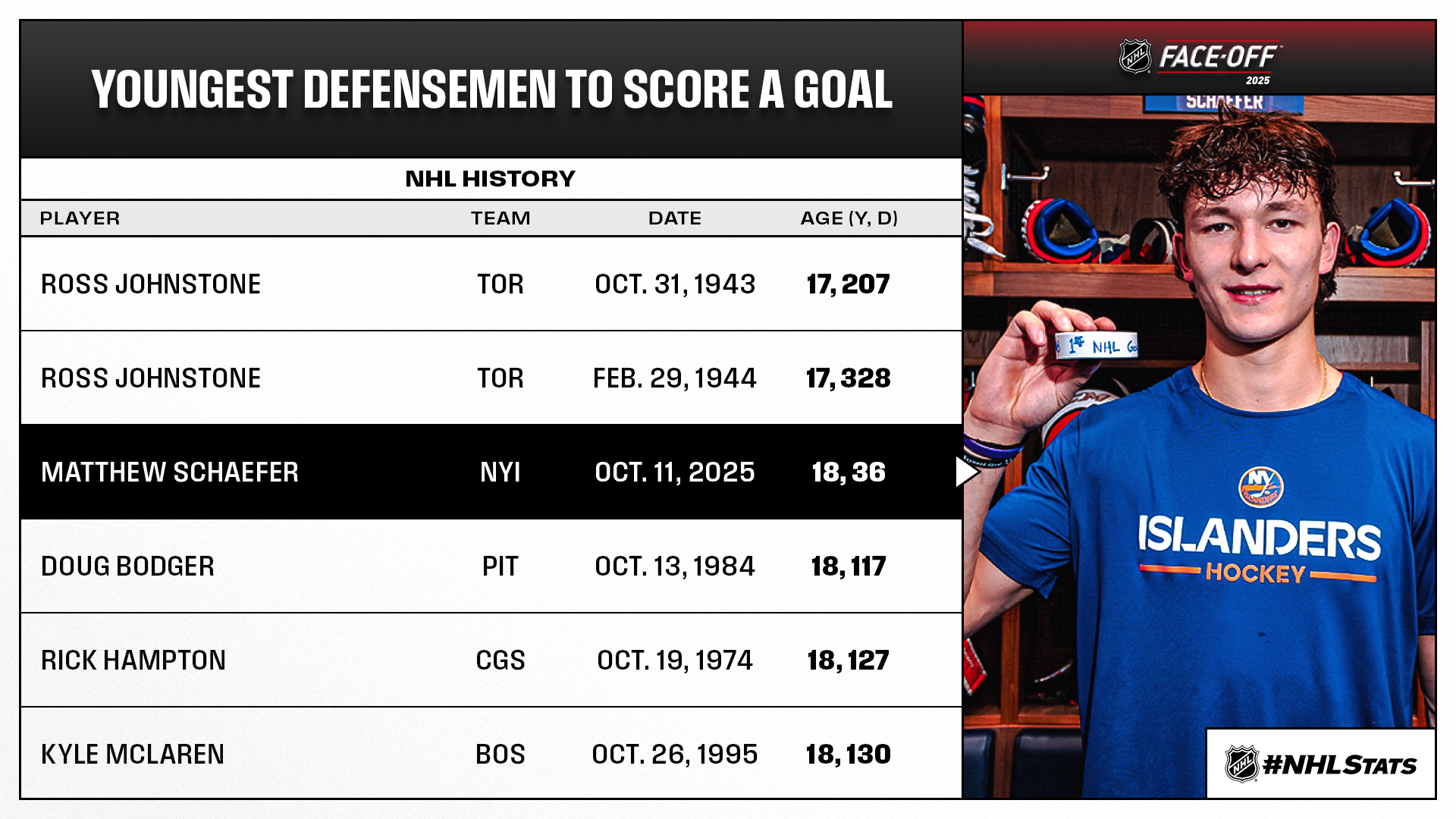 * Schaefer found the score sheet for the second time in as many games to begin his NHL career and did so with his first goal. Schaefer, the third Islanders defenseman to collect a point in each of his first two career games, became the fifth-youngest player in the past 50 years (since 1975-76) to score a goal behind Aleksander Barkov (18 years, 31 days), Jordan Staal (18 years, 32 days), Patrick Marleau (18 years, 34 days) and Nino Niederreiter (18 years, 35 days).