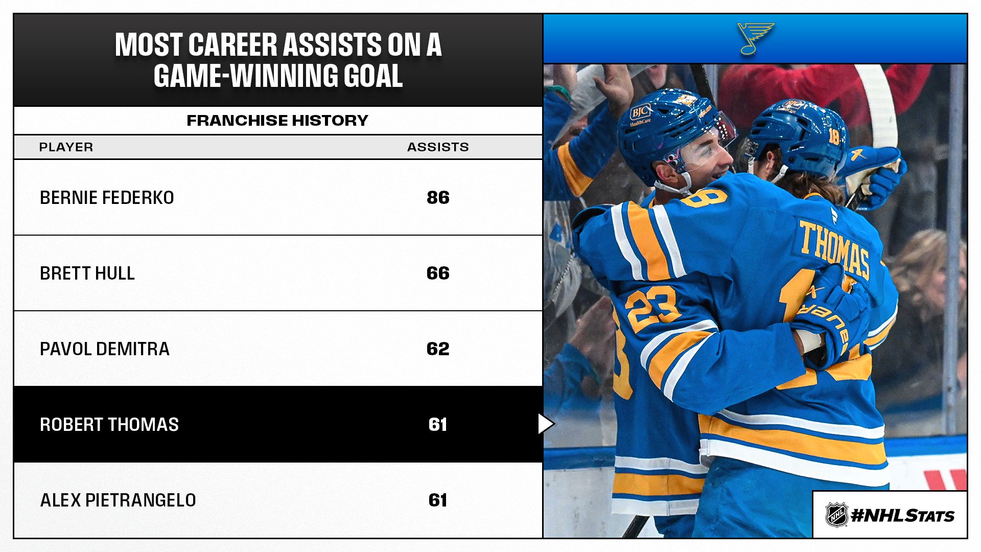 * Connor Bedard (0-2—2) factored on two Blackhawks goals en route to his 40th career multi-point game, but Robert Thomas (0-2—2) also collected two assists – including a helper on the game-winning goal – as the Blues improved to 8-2-0 in their past 10 home games against their longtime rival. Overall, Thomas (19-61—80) became the ninth player in franchise history to factor on 80 career game-winning goals.