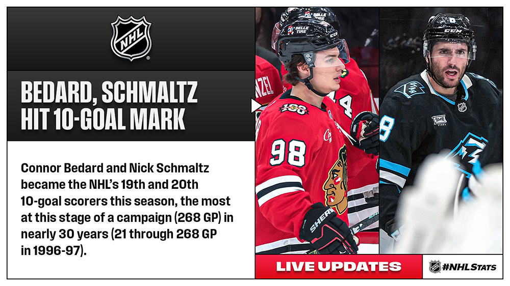 Wednesday’s edition of #NHLStats: Live Updates featured more notes from the four-game slate, including Connor Bedard and Nick Schmaltz (1-1—2) becoming the League’s 19th and 20th 10-goal scorers this season. Bedard reached 26 points on the season to tie Leo Carlsson and Macklin Celebrini for second place in the League’s scoring race.