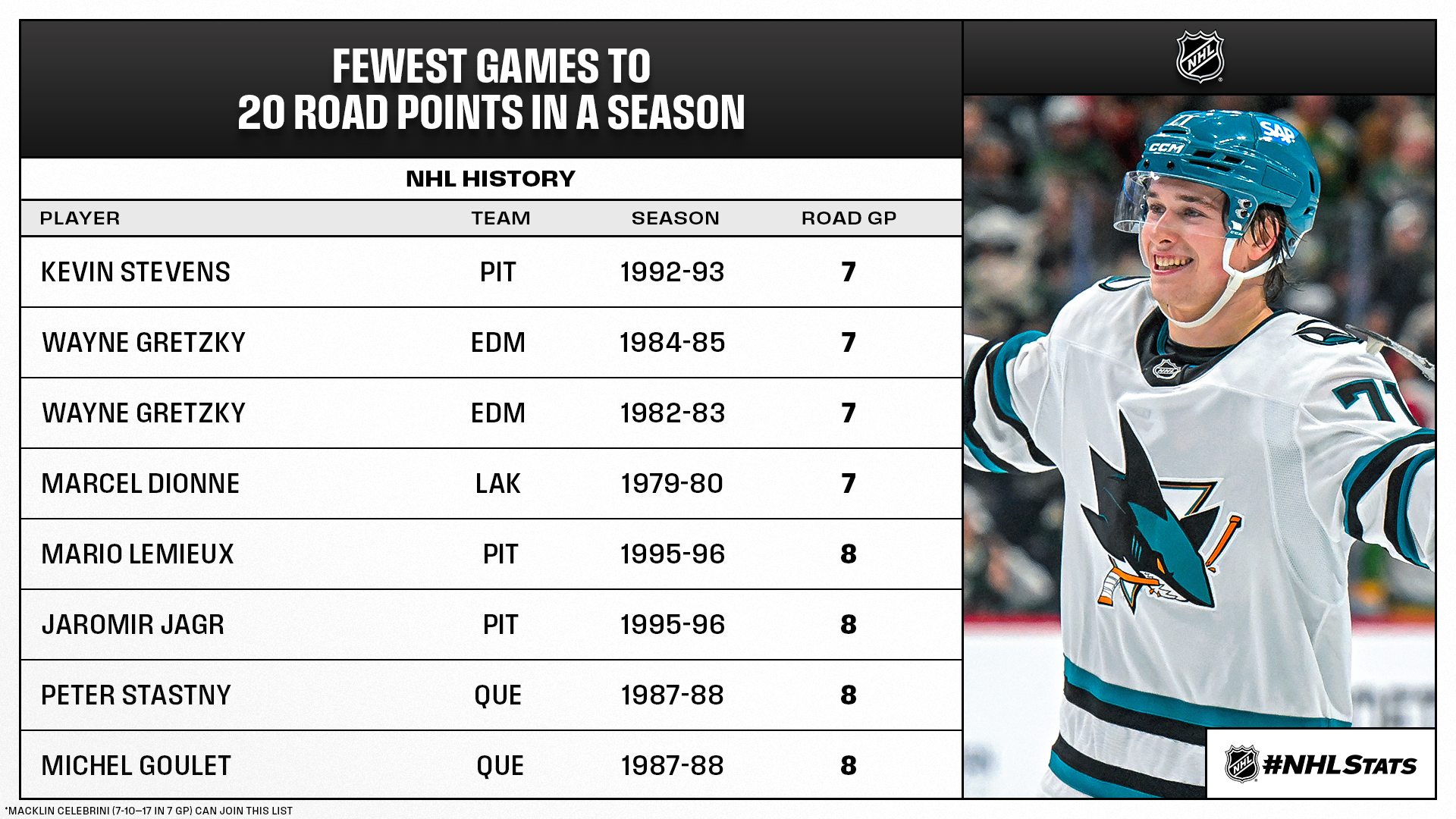 * Macklin Celebrini (10-16—26 in 17 GP) has his sights on lifting San Jose to its first five-game winning streak since 2019-20 (6 GP) and sits tied for second in scoring this season after strings of strong performances on the road (7-10—17 in 7 GP). His three three-point road games in 2025-26 are tied with Connor Bedard and Artemi Panarin for the most among all players and another such performance would make the 19-year-old Sharks forward the first player since Jaromir Jagr and Mario Lemieux (both 8 GP in 1995-96) to reach 20 road points in a season in eight or fewer games.