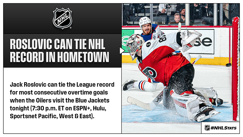 * Roslovic became the second player in franchise history with an overtime goal in consecutive team contests, following Andrew Cogliano (3 GP from March 7-11, 2008) whose three-game streak is the longest in NHL history. Roslovic had three overtime goals through his first 540 career games before Monday and could tie a League benchmark during a national telecast tonight in his hometown (and against his former club).