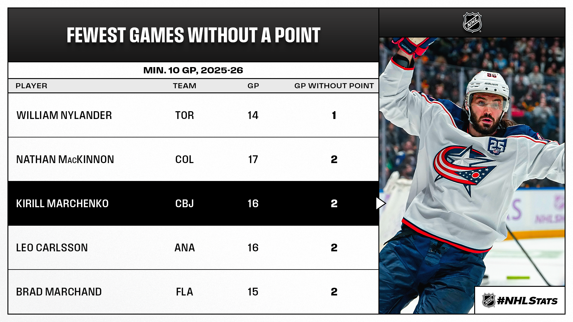 * The Blue Jackets seek a win against the Oilers, who mounted a multi-goal, third-period comeback win Nov. 10, and look to do so with the services of their leading scorer Kirill Marchenko (8-10—18 in 16 GP). Marchenko, who has found the score sheet in all but two games this season, is riding a nine-game point streak and can become the fifth player in franchise history to push that stretch to double digits; Ryan Johansen (2x; longest: 13 GP in 2014-15), Cam Atkinson (12 GP in 2018-19), Patrik Laine (11 GP in 2021-22) and R.J. Umberger (10 GP in 2010-11) are the only ones to do so to date.