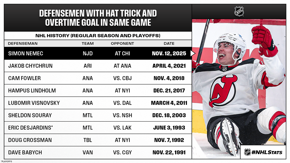 Simon Nemec became the youngest defenseman in NHL history with a hat trick and overtime goal in the same game as the Devils rallied past the Blackhawks.