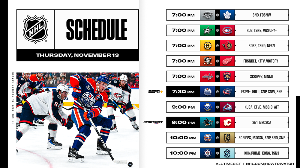 There will be plenty of star power throughout the 10 games on tap Thursday, including a rematch from three days ago between the Oilers and Blue Jackets on ESPN+ and Hulu. Meanwhile, the Bruins, Avalanche and Sharks will look to extend team and player streaks, with the latter doing so on Sportsnet.