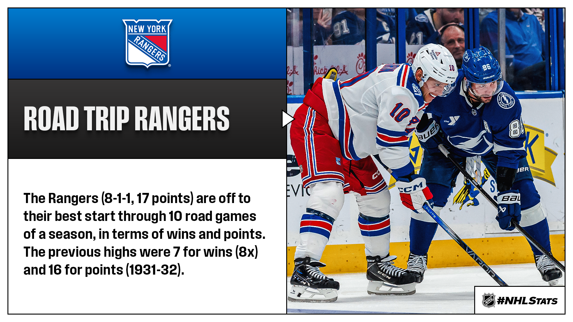 The Rangers led the Lightning by a 4-3 margin after the opening frame – the first seven-goal first period in the NHL since March 16, 2023 – and scored three more times en route to their NHL best eighth road win of the season. New York has won five straight games as visitors – the longest road winning streak in the NHL this season – and own the best road record in the League (8-1-1, 17 points), their best at this stage across their 99 seasons.
