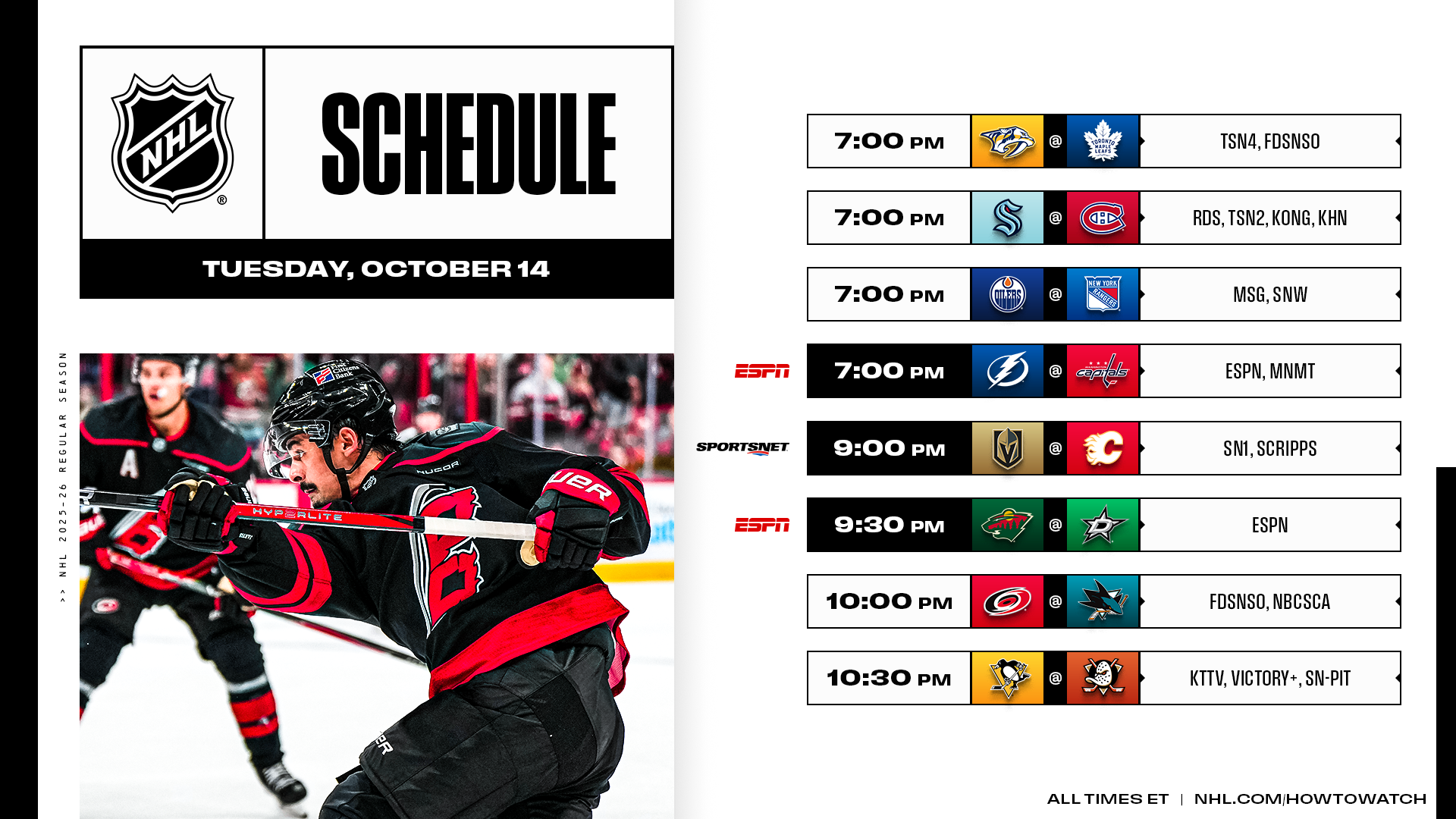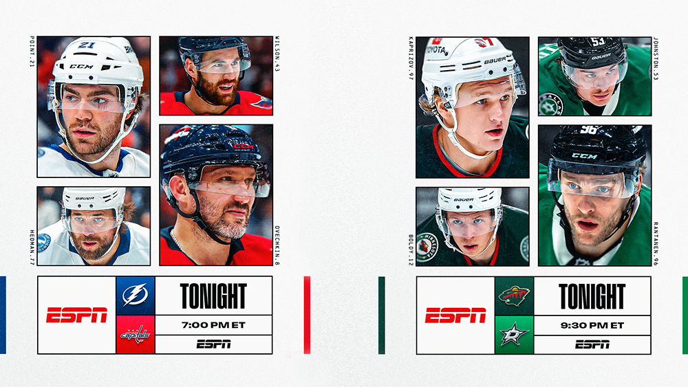 * An ESPN doubleheader headlines Tuesday’s slate as Nikita Kucherov’s Lightning and Alex Ovechkin’s Capitals go head-to-head before the Wild and Stars clash in a divisional duel.