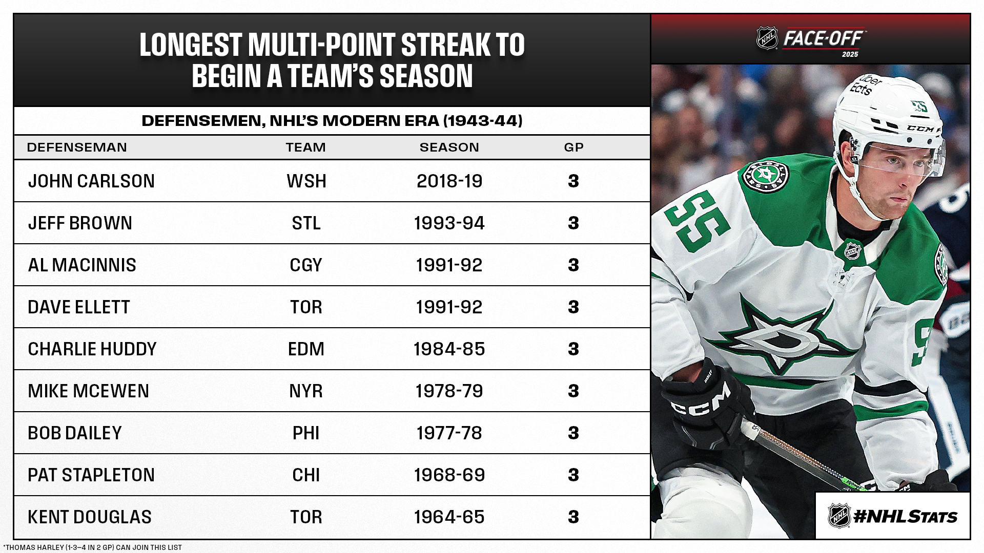 * Thomas Harley (1-3—4 in 2 GP) can become the fourth player in Stars/North Stars history to record multiple points in his team’s first three games of a season. He would join Brad Richards (4 GP in 2010-11), Dino Ciccarelli (3 GP in 1986-87) and Tim Young (3 GP in 1976-77).
