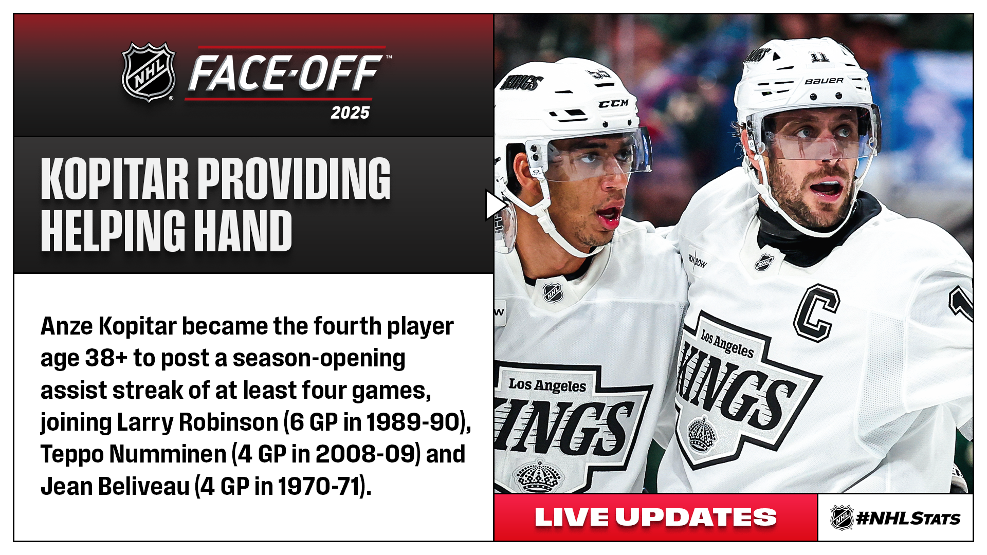 * Kopitar (0-1—1) collected an assist during the Kings‘ three-goal rally to help them salvage a point in their shootout loss to the Wild. In doing so, Kopitar (0-4—4 in 4 GP) recorded his third career season-opening assist streak of at least four games (also 2019-20 & 2009-10), marking the most in franchise history.