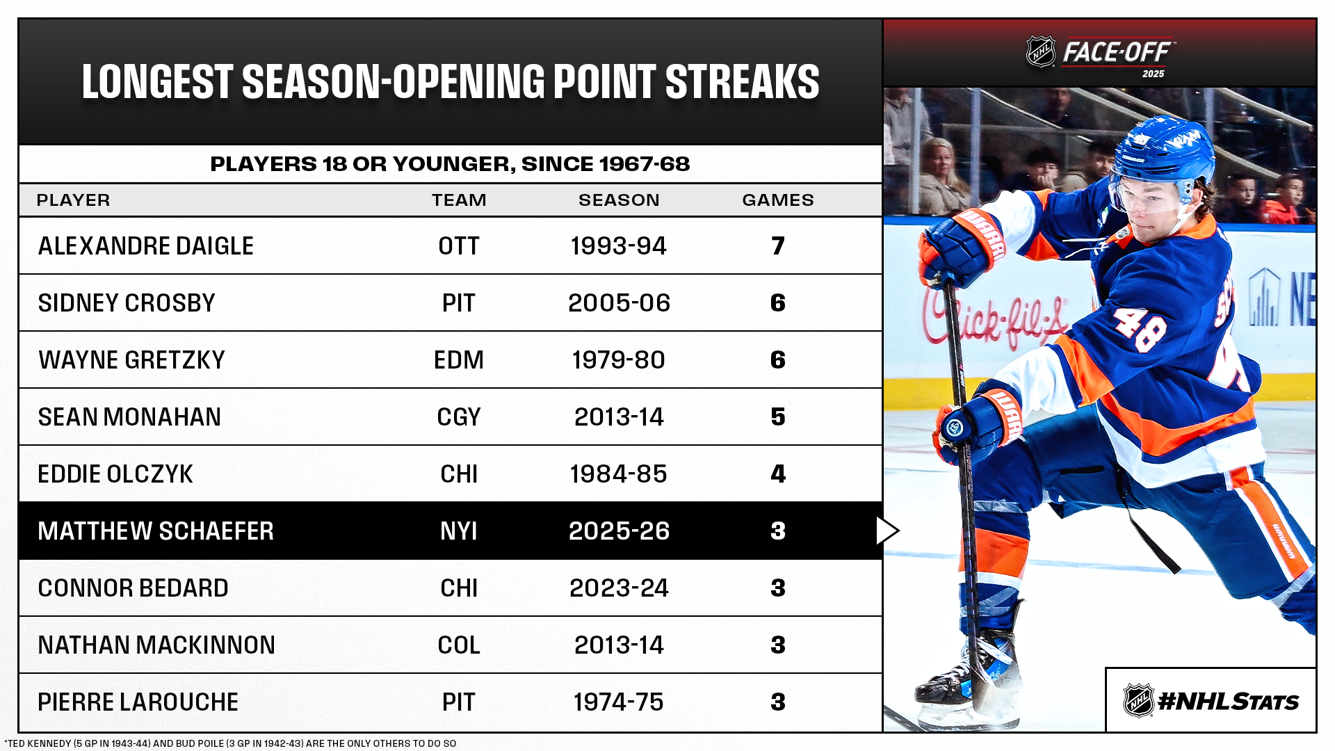 * Matthew Schaefer continues to pick up points to start his NHL career and achieved more notable feats as a teenager Monday, including becoming the first defenseman age 18 or younger in League history to register a season-opening point streak of at least three games.