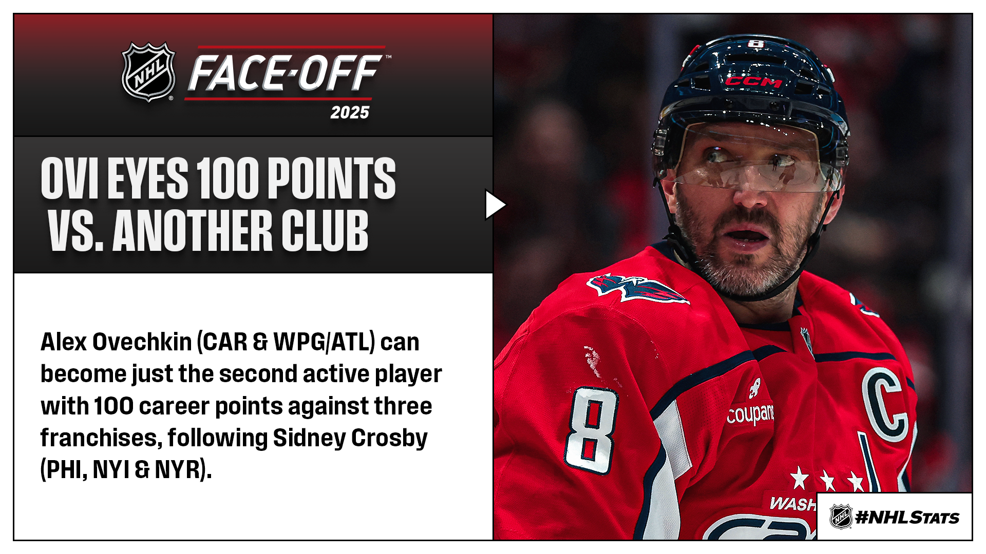 * Ovechkin (51-46—97 in 83 GP) enters Tuesday three points away from recording 100 against the Lightning. The only other franchises he has as many against are the Hurricanes (52-55—107 in 93 GP) and the Jets/Thrashers (57-45—102 in 75 GP).