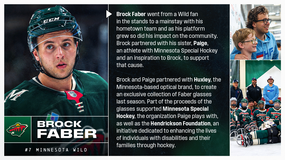 * Brock Faber, Maple Grove, Min., grew up a Wild fan and is using his platform as a player to give back to his community. Faber’s efforts are inspired by his sister, Paige, who is a star athlete in many sports including adaptive hockey. The brother-sister duo teamed up to raise money for Minnesota Special Hockey as well as the Hendrickson Foundation, an organization that uses hockey to enhance the lives of individuals with disabilities.