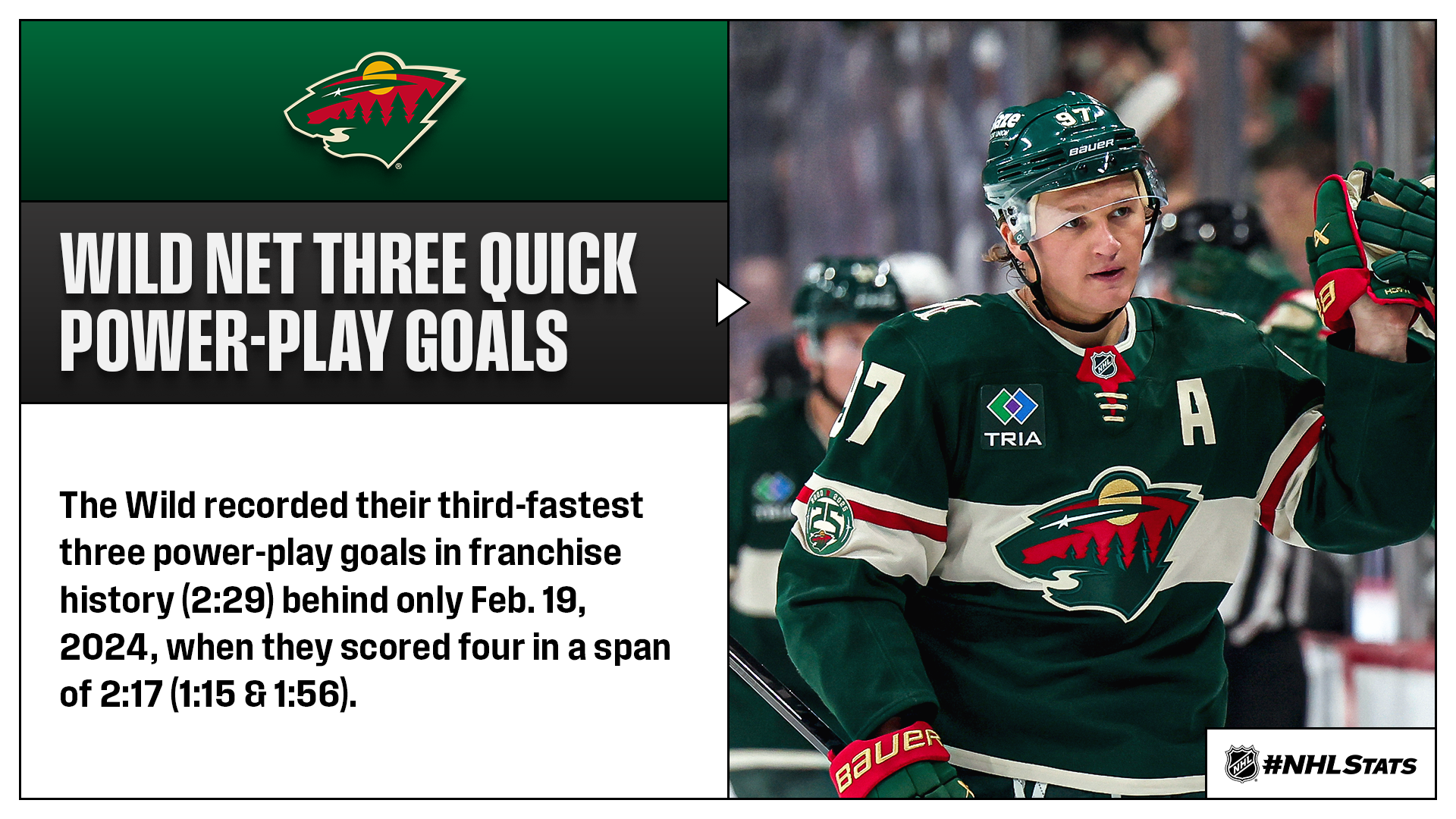 * Kaprizov and Boldy scored their goals 20 seconds apart on the man advantage, marking the third-fastest two power-play goals in franchise history behind 11-second spans on both Dec. 5, 2014 and Nov. 5, 2007. It also marked the fastest two power-play goals League wide since Nov. 24, 2023 (TBL; 0:14).