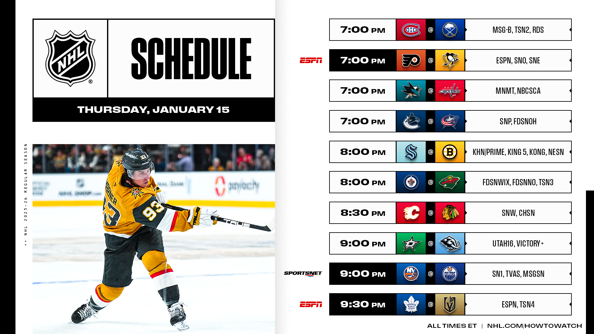 Thursday’s ESPN doubleheader begins with the latest Battle of Pennsylvania as the Flyers and Penguins go head-to-head for key standings points and concludes with Mitch Marner facing his former team for the first time when the Golden Knights welcome Auston Matthews and the Maple Leafs. A matchup north of the border pits a pair of No. 1 picks against each other on Sportsnet ONE when Matthew Schaefer and the Islanders visit Connor McDavid and the Oilers.