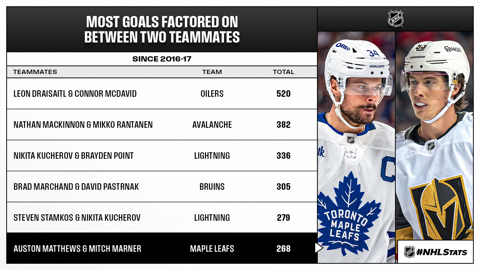 * Marner was selected by Toronto with the fourth-overall pick in the 2015 NHL Draft, played nine seasons with the club and ranks among the top five for the franchise in assists (4th), overtime goals (t-5th), multi-assist games (1st) and multi-point games (4th). He began his career alongside Matthews, with the former teammates skating in 588 career games together and posting a 344-173-71 record in those contests. The duo factored on 268 goals together, which is the most in Maple Leafs history.