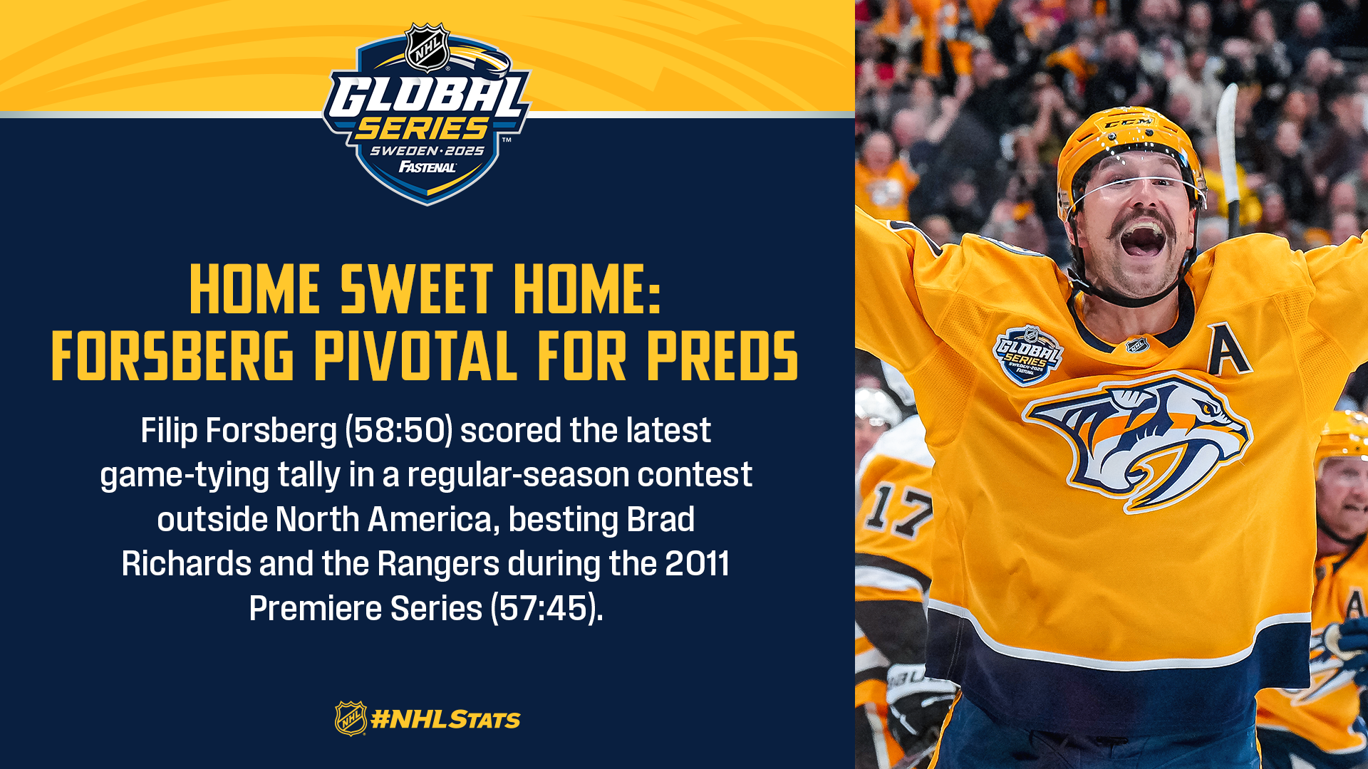 Filip Forsberg (Ostervala, Sweden) returned to his home country and sparked a Predators come-from-behind win in front of a sellout crowd of 12,766 at Avicii Arena for the first of two games at the 2025 NHL Global Series Sweden presented by Fastenal.