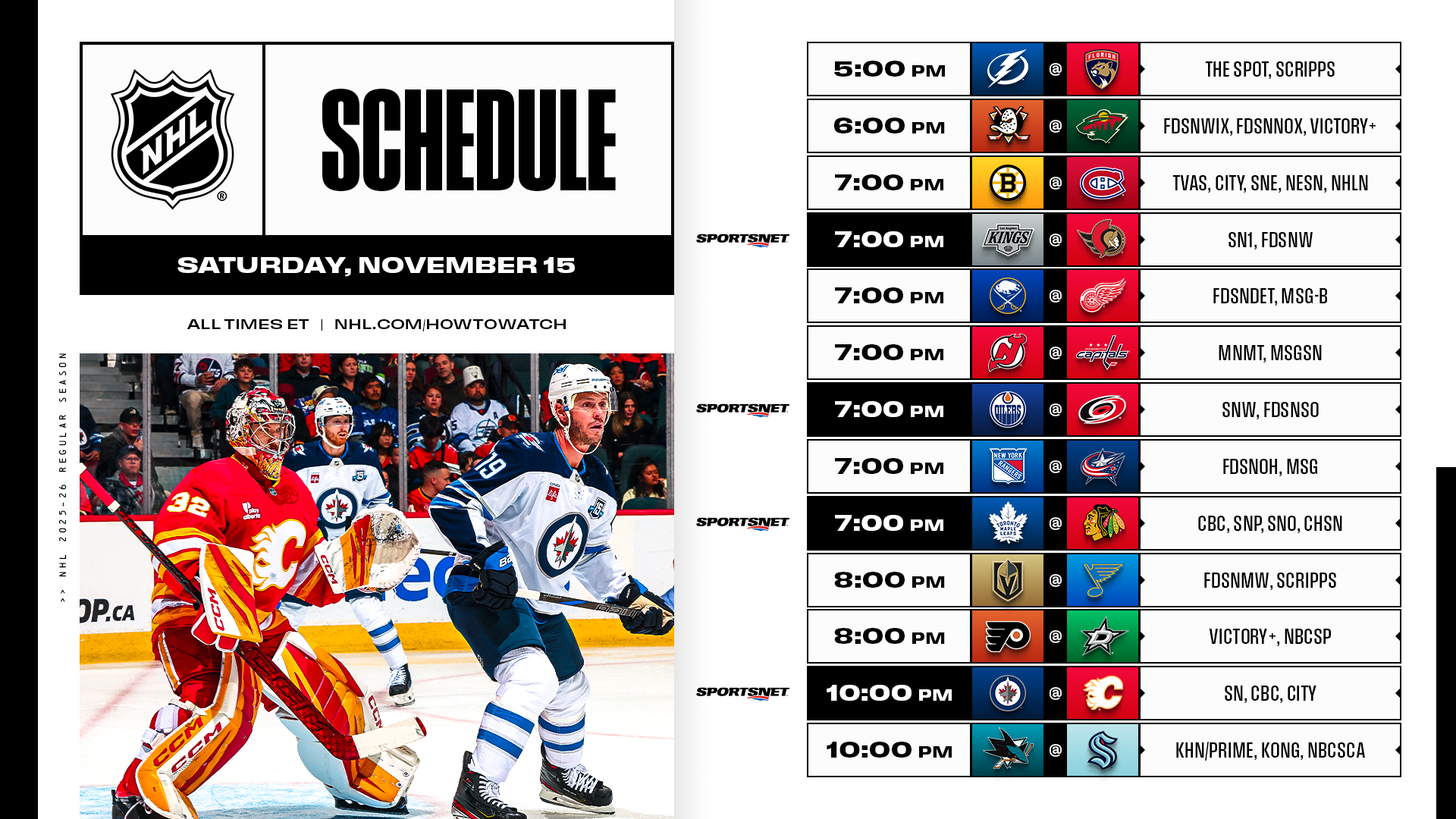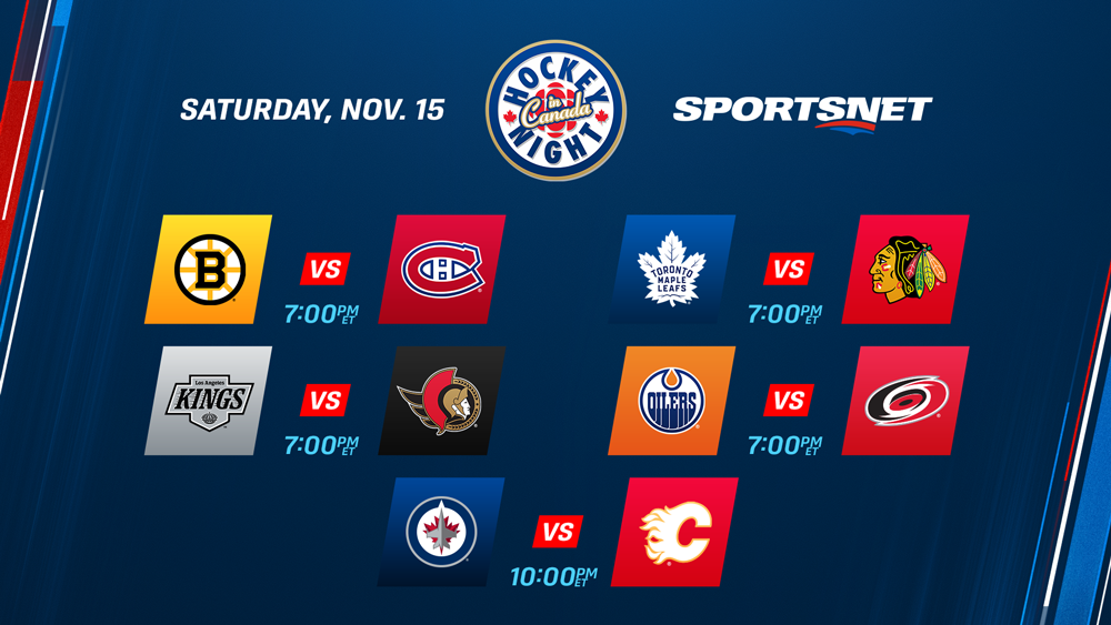 Saturday’s 13-game schedule is highlighted by five Hockey Night in Canada contests and features the three teams tied for most points atop the Atlantic Division standings in the Canadiens, Senators and Bruins.