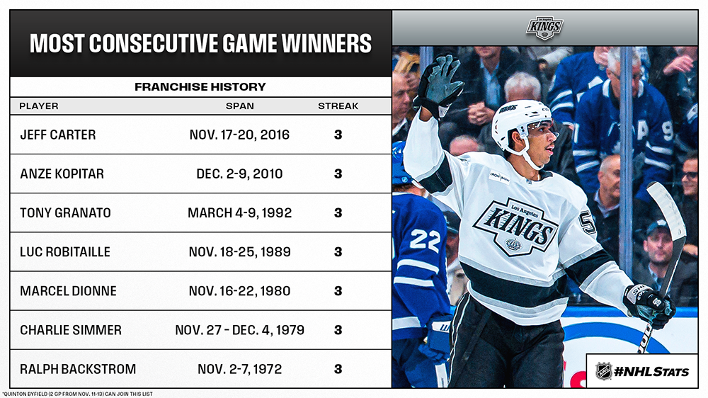 * Quinton Byfield buried the overtime winner in his hometown Thursday, his second game-winning tally in as many games, and leads Los Angeles into its contest against Ottawa, which snapped Boston’s seven-game winning streak that same night. The last contest between the Kings and Senators in Ottawa was on Oct. 14, 2024, and featured 15 combined goals – tied for highest single-game total over the past two seasons.