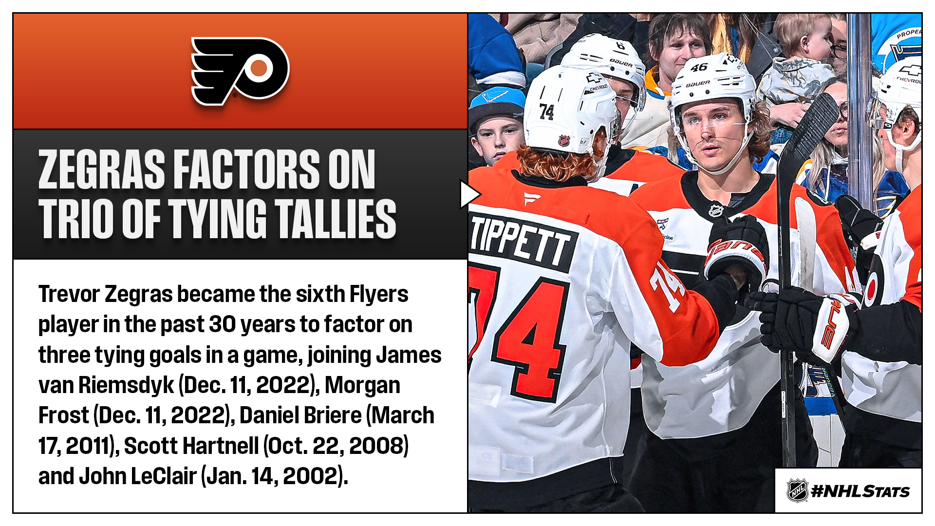 * The Blues went up 1-0, 3-1 and 5-3 on Friday, but the Flyers overcame three deficits to win a road game for the first time in over a decade (previous: Oct. 18, 2014) with the help of Zegras, who factored on all three tying goals and netted the shootout winner. Zegras has factored on eight game-tying goals in total this season, surpassing Vince Dunn and Nathan MacKinnon (both w/ 7) for the most in the League.