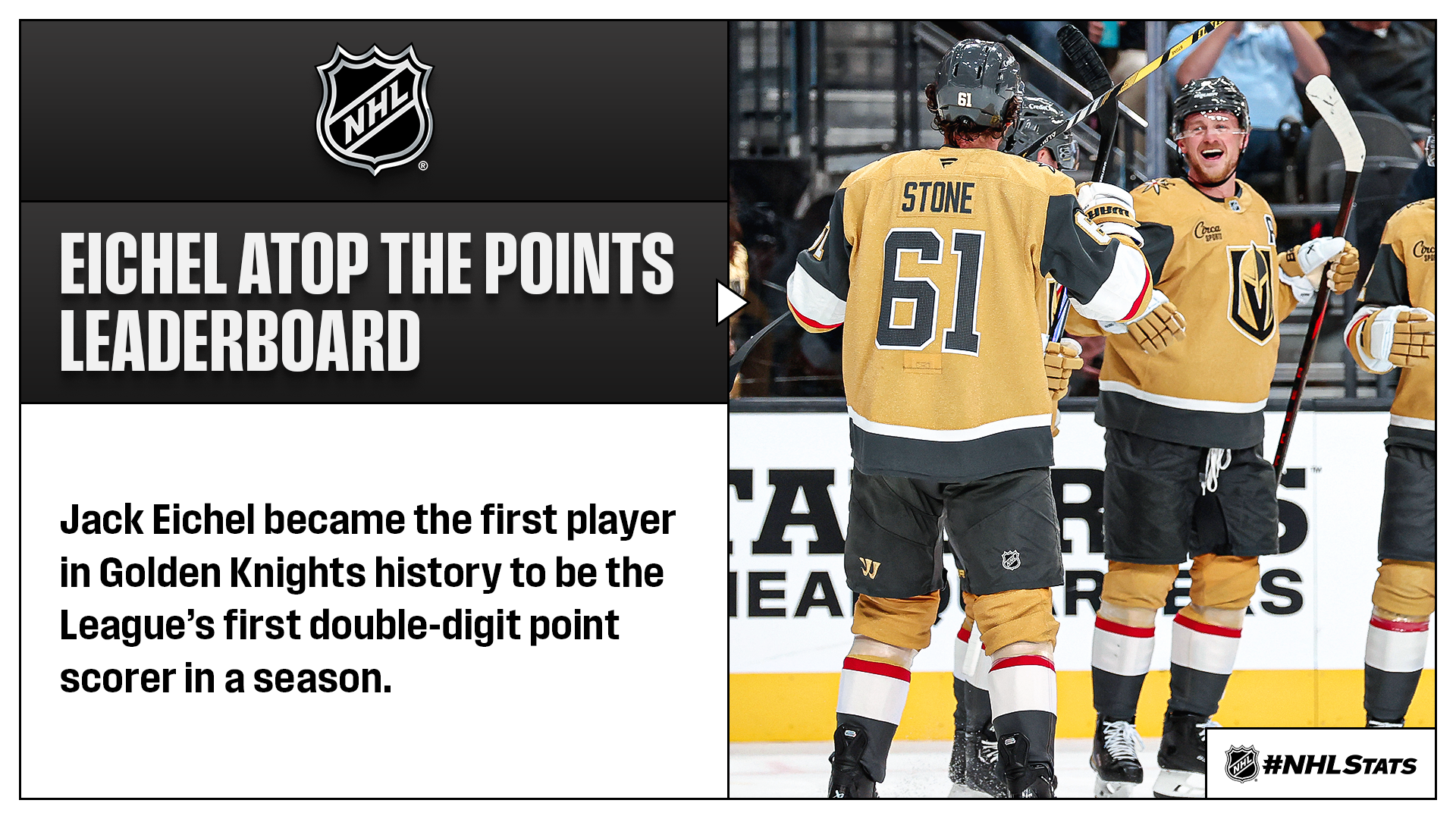 * The Vegas trio of Jack Eichel, Mark Stone and Pavel Dorofeyev led the Golden Knights to victory and are currently leading the NHL in scoring across all three categories of goals, assists and points (tied or outright).