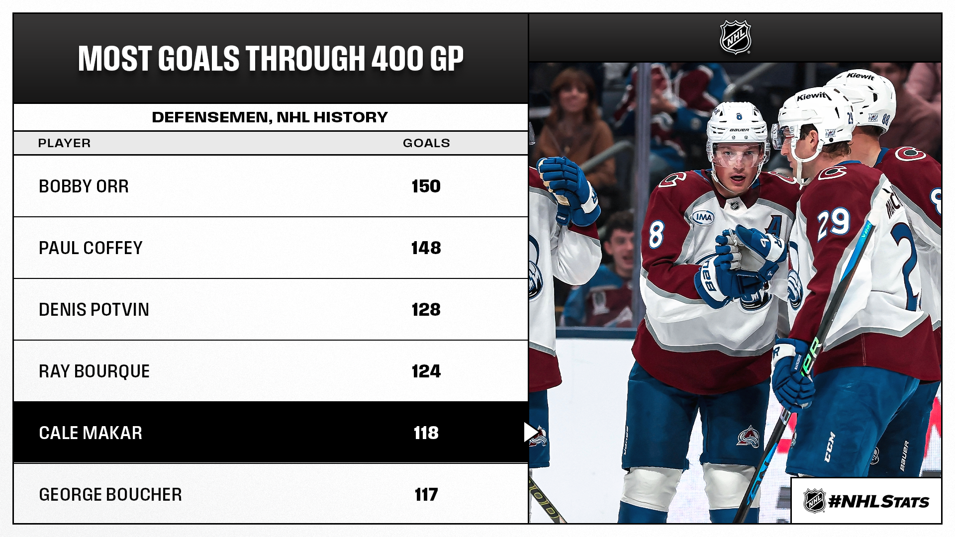 * Makar (1-1—2) scored the first of four unanswered Avalanche goals to help his club improve to 4-0-1 to start 2025-26, marking their fourth-longest season-opening point streak in the past 24 years. Makar (118-317—435 in 400 GP) surpassed George Boucher (117) for the fifth-most goals by a defenseman through his 400th NHL game. His point total stands as the third most by a blueliner through that milestone contest in League history, behind Bobby Orr (508) and Paul Coffey (475).
