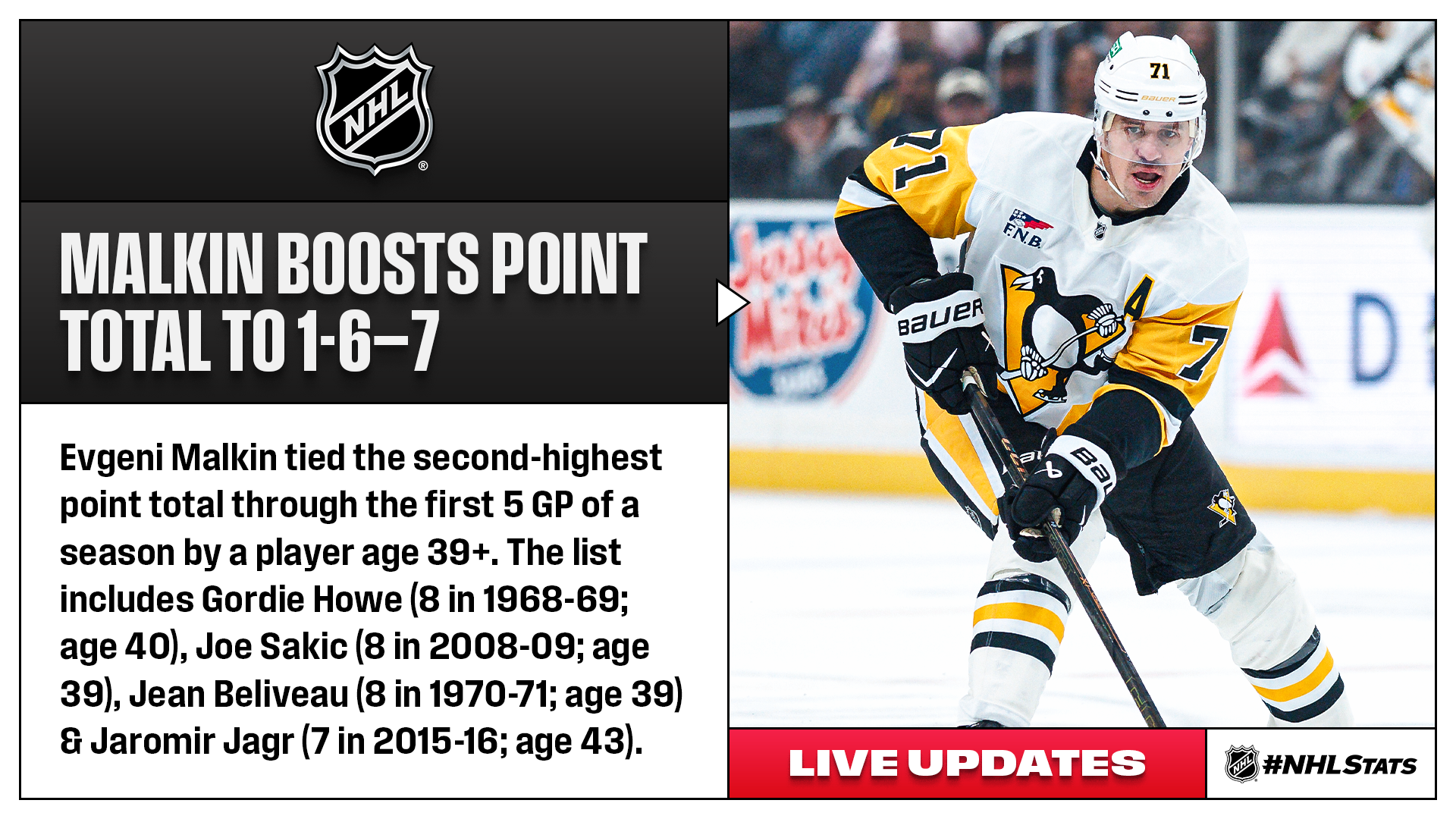 Thursday’s edition of #NHLStats Live Updates included notes on Bo Horvat’s natural hat trick; the Devils improving to 7-0-0 when Jack Hughes, Nico Hischier and Timo Meier all score; Seth Jarvis (2-1—3) helping the Hurricanes remain perfect; and Evgeni Malkin and Sidney Crosby finding the back of the net while skating in their 1,070th regular-season game together, which moved them into sixth in NHL history for most by a pair of teammates.