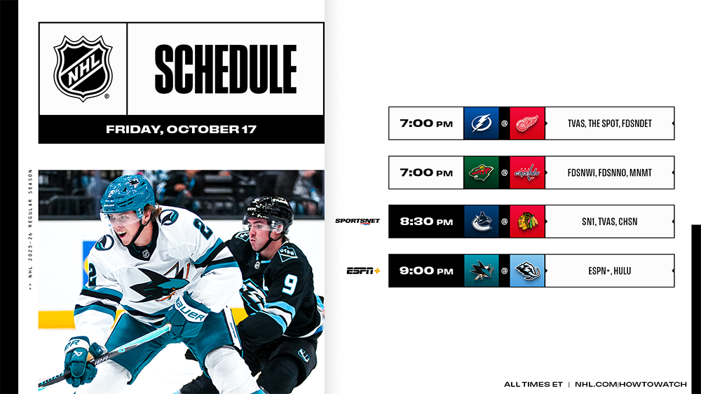 * A four-game Friday will feature the Canucks visiting the Blackhawks on Sportsnet One in a national broadcast across Canada, before the Sharks and Mammoth clash in the U.S. on ESPN+ and Hulu.