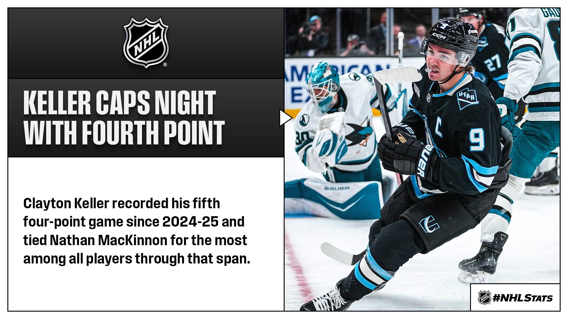The Mammoth posted their highest-scoring performance of the season thanks to a pair of four-point nights from Nick Schmaltz (3-1—4) and Clayton Keller (1-3—4). They became the first pair of teammates this season to each record four points in the same game as Utah improved to 2-0-0 at Delta Center and remained one of six teams still perfect on home ice in 2025-26.