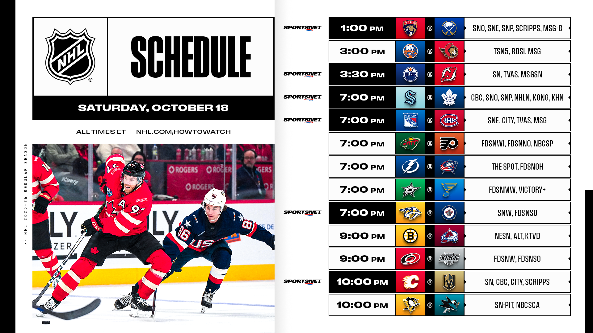 With the Olympic Winter Games Milano Cortina 2026 approaching the “100 Days to Opening Ceremony” countdown Oct. 29, the global audience will get plenty of NHL action this weekend as NHL Saturday & NHL Sunday presented by Fastenal kickstarts action both today and tomorrow. In Saturday’s opener, the Sabres will vie for a second straight win when the reigning Stanley Cup champions come to town – part of a matinee slate that also puts Matthew Schaefer’s point streak on the line alongside the ninth all-time meeting between Connor McDavid and Jack Hughes (and first since the 4 Nations Face-Off final).