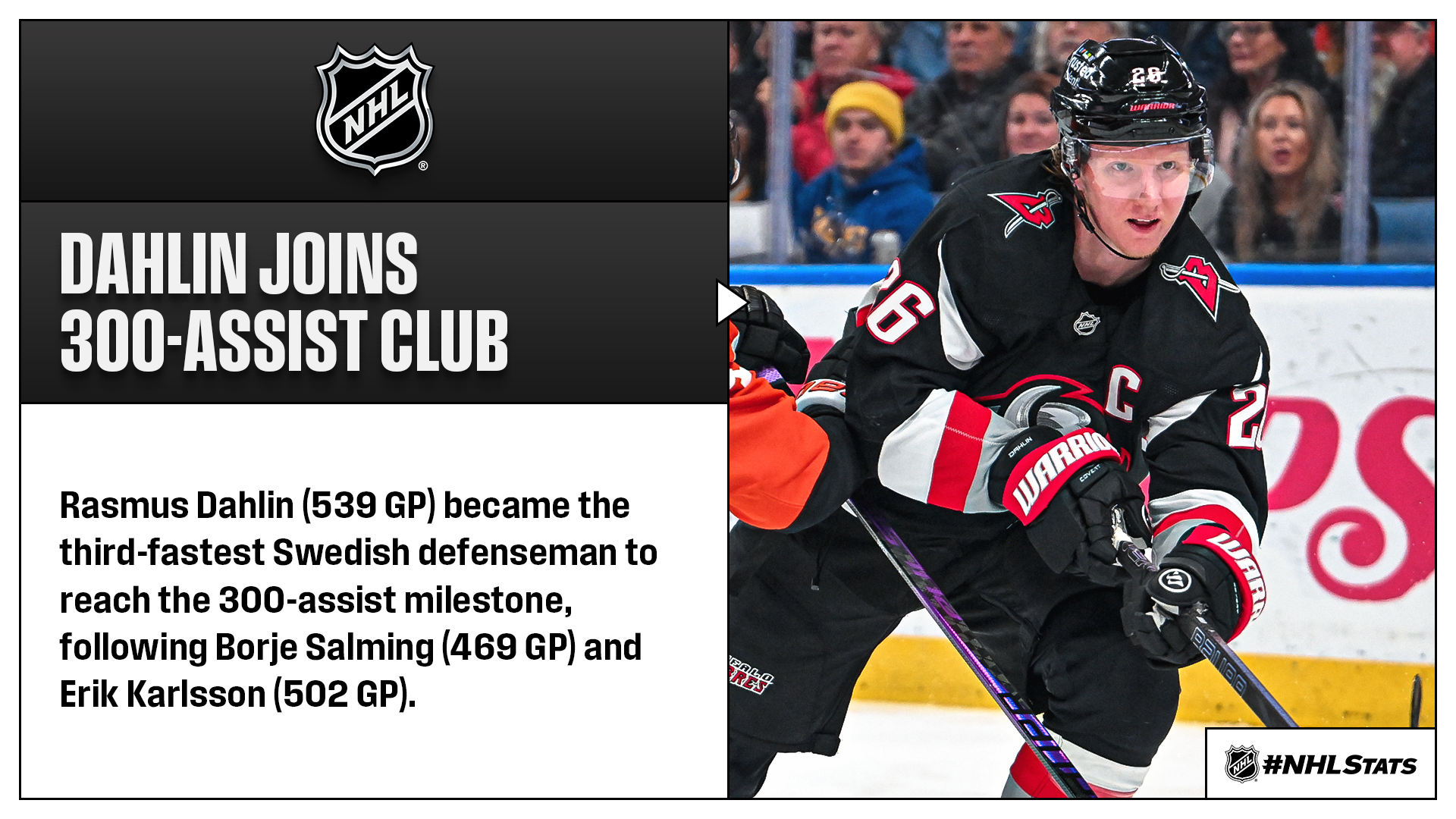 * Rasmus Dahlin (0-1—1) notched his 300th career assist and helped the Sabres skate to their fourth straight win. Dahlin became the ninth player in franchise history to record 300 assists with the franchise and just the second defenseman on that list, following Housley (380).