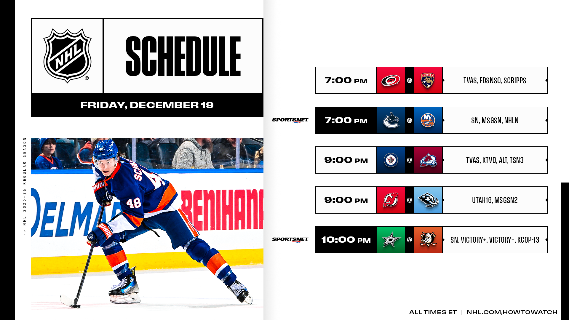 Nathan MacKinnon (28-30—58 in 33 GP) and Matthew Schaefer (9-14—23 in 35 GP) are each in action on the NHL’s five-game Friday when the Avalanche (24-2-7, 55 points) welcome the Jets (15-16-2, 32 points) to Ball Arena and the Islanders (19-12-3, 41 points) host the Canucks (13-17-3, 29 points) at UBS Arena.