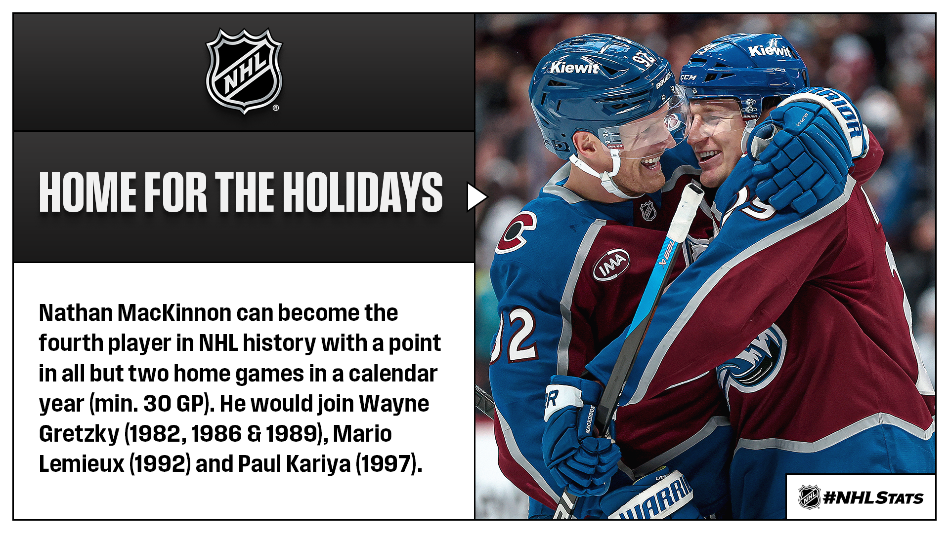 * MacKinnon, with at least one point in all but two home games in the regular season and playoffs combined since Jan. 1, 2025 (38 of 40 GP), has four contests remaining at Ball Arena to close out the calendar year and sits two points shy of becoming the NHL’s first 60-point player in 2025-26. The current Art Ross Trophy leader can require the fewest games in franchise history to 60 points in a season – Peter Stastny (35 GP in 1987-88 & 1981-82) and Marian Stastny (35 GP in 1982-83) currently hold the distinction.