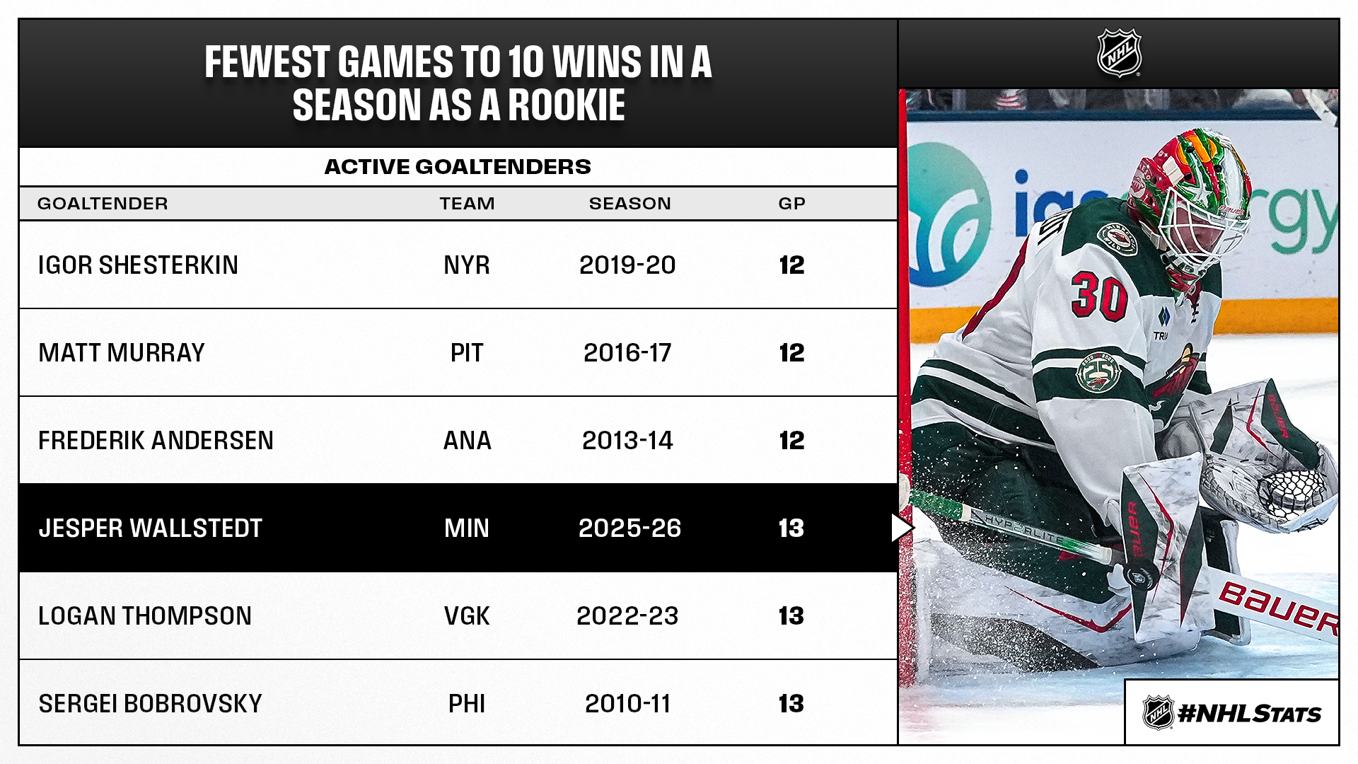 * Wallstedt (13 GP) tied Devan Dubnyk (13 GP in 2014-15) for the fewest games to 10 wins in a season by a Wild goaltender and became the franchise’s fastest rookie to the mark, besting Kaapo Kahkonen (14 GP in 2020-21).