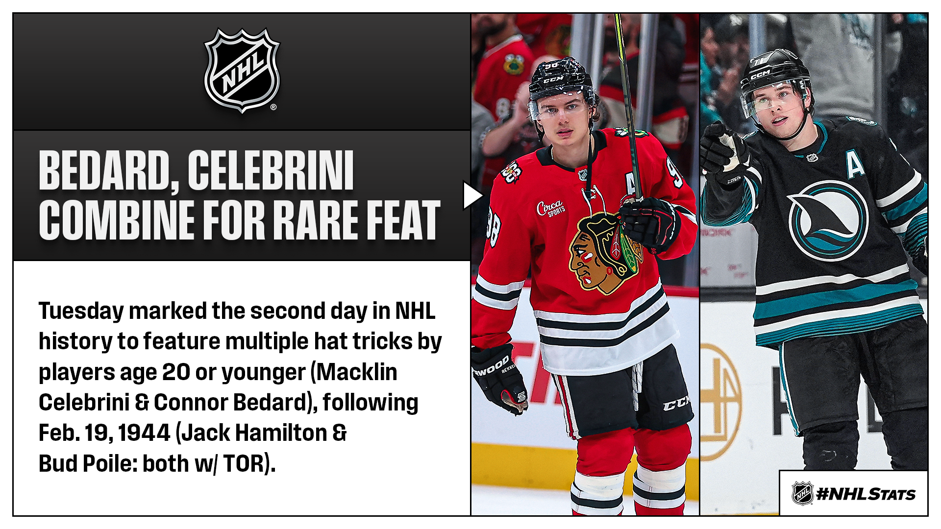 A hat trick of hat tricks happened on home ice Tuesday as Connor Bedard and Macklin Celebrini teamed up for a rare feat following Jake Guentzel’s three-goal performance earlier in the night. Bedard and Celebrini also moved within one of the League lead in goals.
