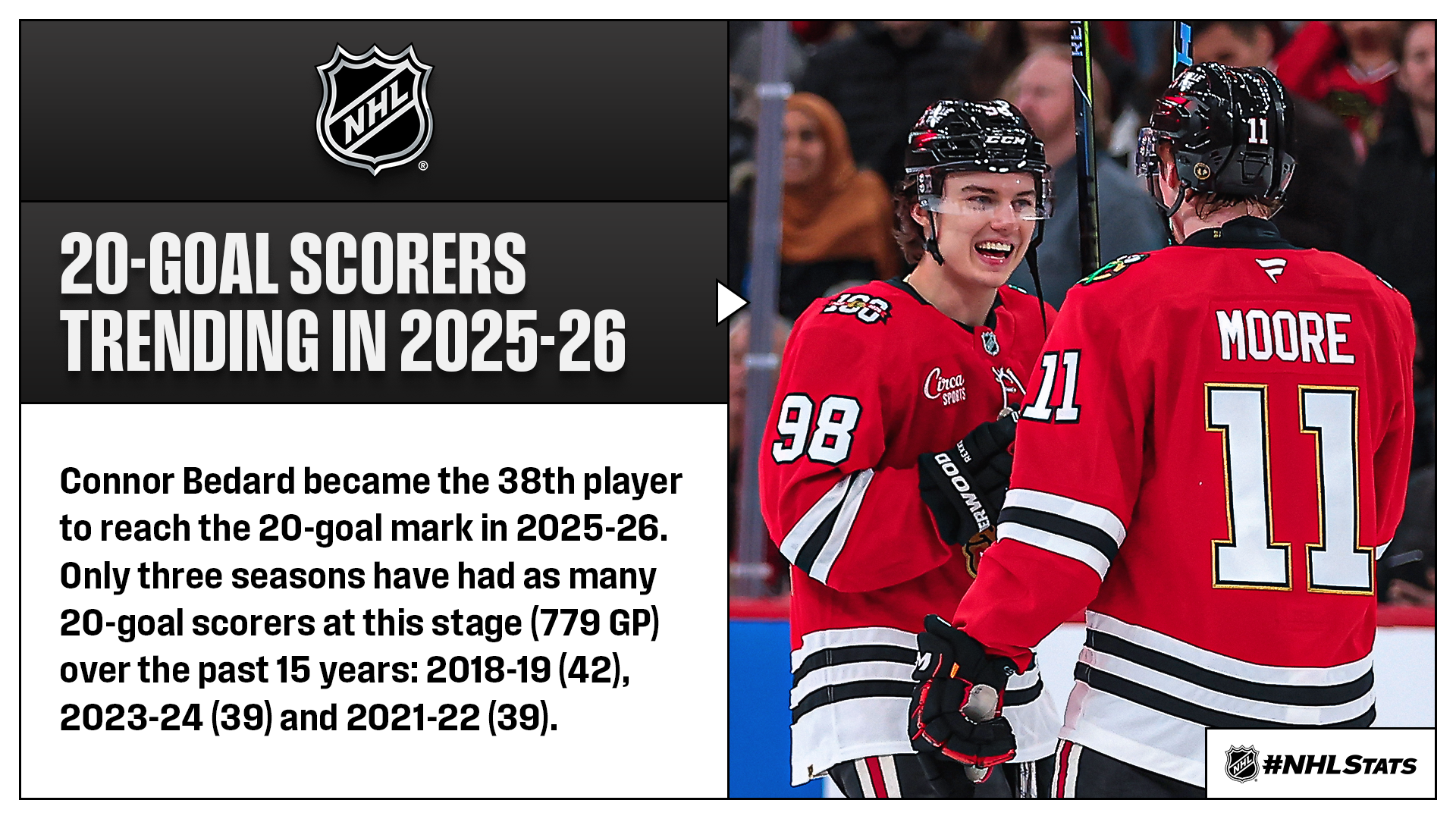 * Connor Bedard (1-0—1) scored one of two Blackhawks goals as they earned a shutout win against the Jets and hit the 20-goal mark for the third straight season. He became the fifth player in franchise history to begin his NHL career with three consecutive 20-goal campaigns, joining Patrick Kane (13), Jonathan Toews (12), Denis Savard (10) and Darcy Rota (4). Toews was skating opposite of Bedard last night and was honored with a lengthy and emotional standing ovation in his return to Chicago.