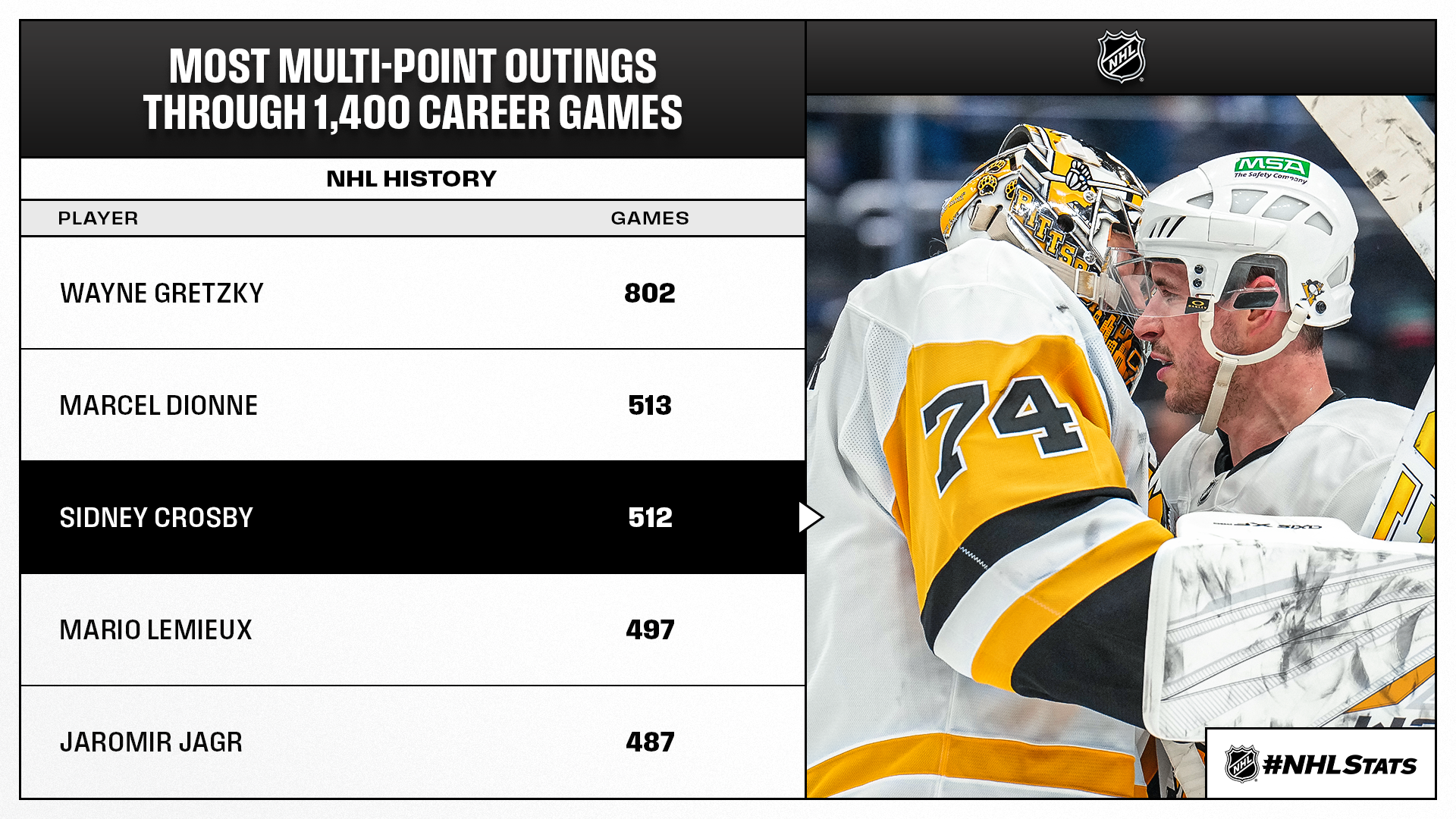 * Crosby notched his 512th career multi-point outing in his 1,400th career game and surpassed Gordie Howe (511 GP) for fifth place on the NHL’s all-time list. The Penguins captain became the 12th player in NHL history to skate in 1,400 games with a single franchise, and third active, alongside Ovechkin (1,541 GP w/ WSH) and Anze Kopitar (1,491 GP w/ LAK).