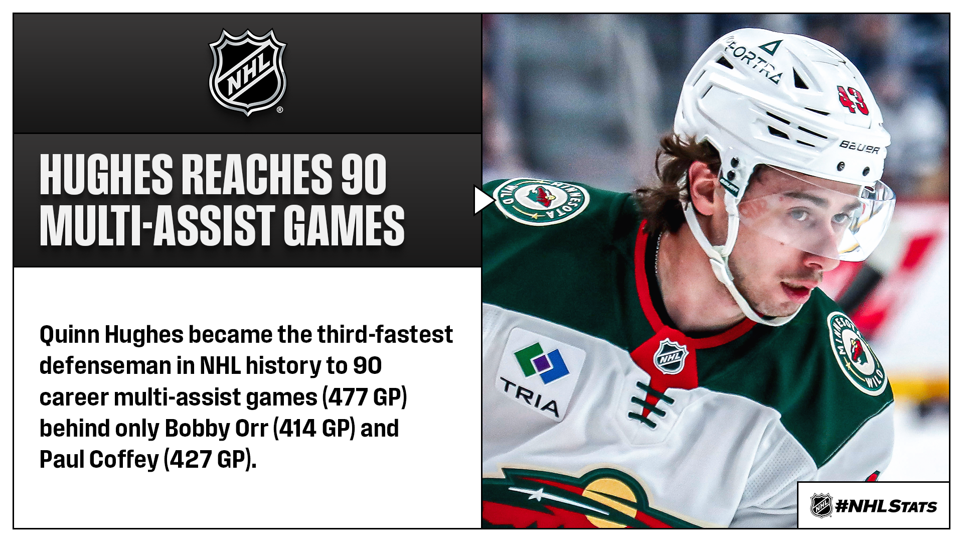 * Quinn Hughes became the third-fastest defenseman to 90 career multi-assist games as the Wild skated to victory Monday and moved into second place in Central Division standings.